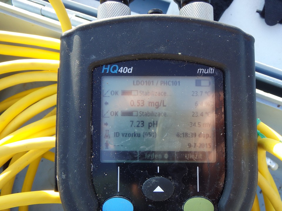 Letos jezdíme monitorovat několik Pohořelických rybníků, především Šumický horní, který je problematický vysokou biomasou vodního květu sinic a nedostatkem kyslíku. Jak je vidět na měřácích, kyslíku tam opravdu moc není. (9.7.2015)