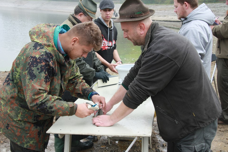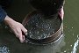 Na počátku krmného experimentu s jeseterem je nezbytné napočítat správné počty ryb do jednotlivých pokusných variant. (21.4.2011)